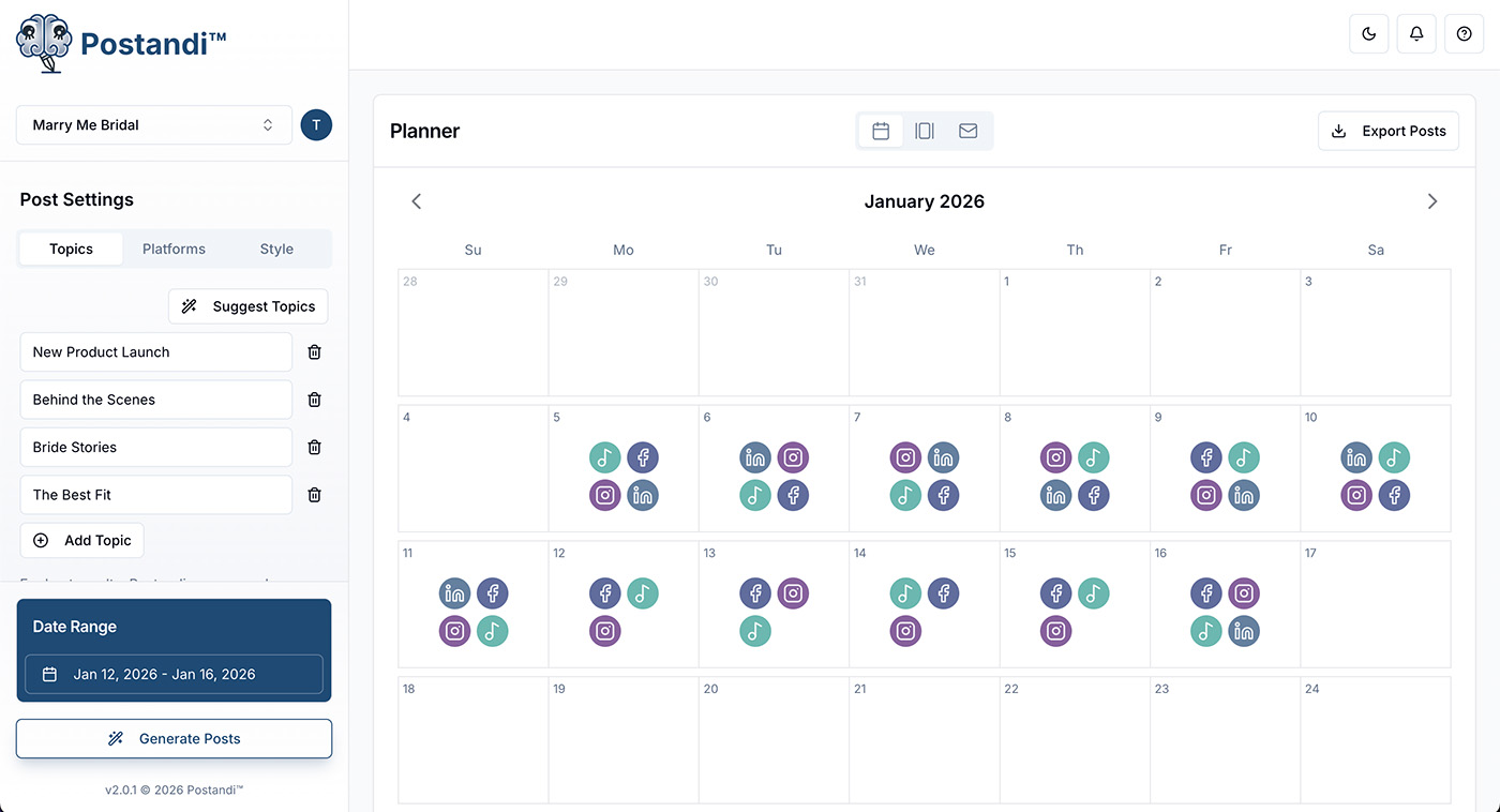 Postandi™ is a web-based content generation platform that helps marketers plan and create AI-powered campaigns, from social posts to blogs and emails, all within a single, intuitive calendar-based workflow.